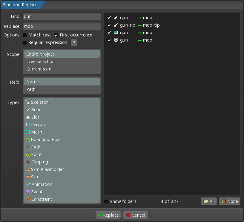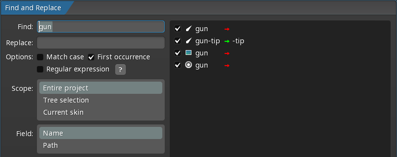 Entire projectwill consider all items in the project.Tree selectionwill only consider items that are selected in the tree. Tree filters can make selecting many tree items easier.Current skinwill only consider items that are in the current skin.Selected skeletonswill only consider items that are in the selected skeletons.
