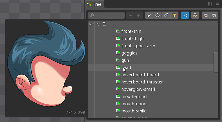 When the mouse is placed over the tree node for a slot, region attachment, or mesh attachment, after a moment the image for the tree node is displayed in a popup next to the tree and the attachment is shown on the skeleton in the viewport. F1 can be used to show the image preview without waiting.
