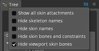 Normally when an attachment is selected in the viewport, it is also selected in the tree. When attachments are hidden in the tree, the attachment's slot is selected in the tree instead. This can make selecting slots easier by selecting an attachment in the viewport rather than digging through the tree to find the slot.