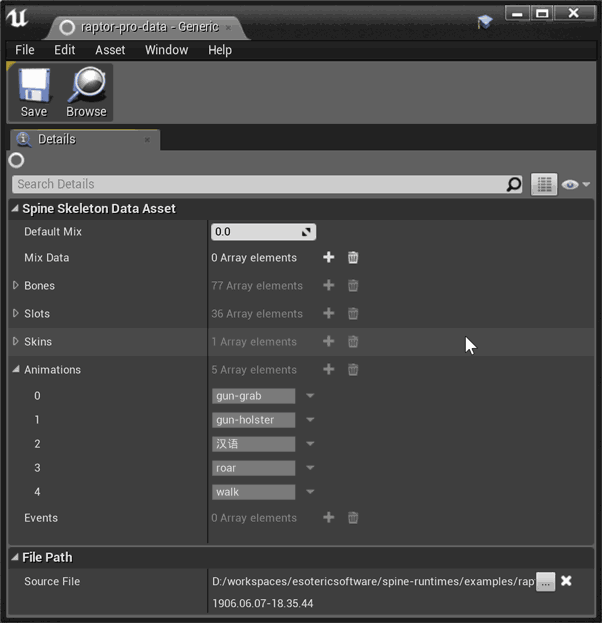 The detail panel for a skeleton data asset also shows all bones, slots, animations, skins, and events contained in the asset.