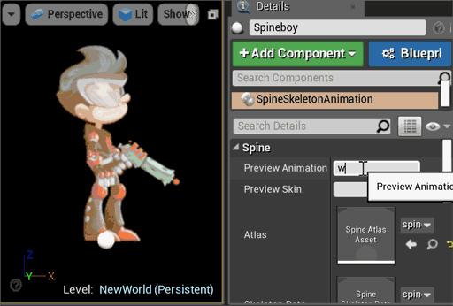 The spine-ue runtime provides you with a set of components that allow to display, animate and modify skeletons exported from Spine. These components reference skeleton data and texture atlas assets you import as described above.