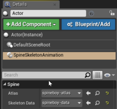 Spine Skeleton Animationcomponent to your actor in its detail panel and set the skeleton data and texture atlas properties to your assets.