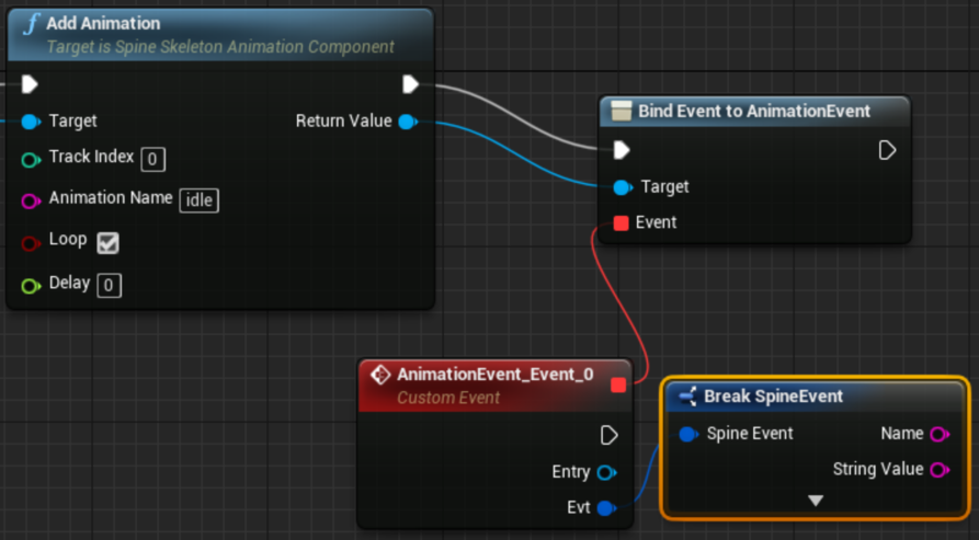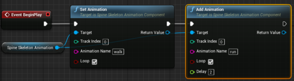 The skeleton animation component exposes the AnimationState API to both blueprints and C++. This section assumes a familiarity with concepts like tracks, track entries, mix times, or animation queuing as described in the section Applying Animations in the generic Spine Runtime Guide.
