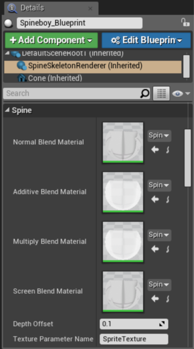 In all cases, you must provide a parameterized material that allows the skeleton renderer component to set the texture source. By default, the renderer component assumes the texture parameter is called "SpriteTexture". You can customize the parameter name on the skeleton renderer component.