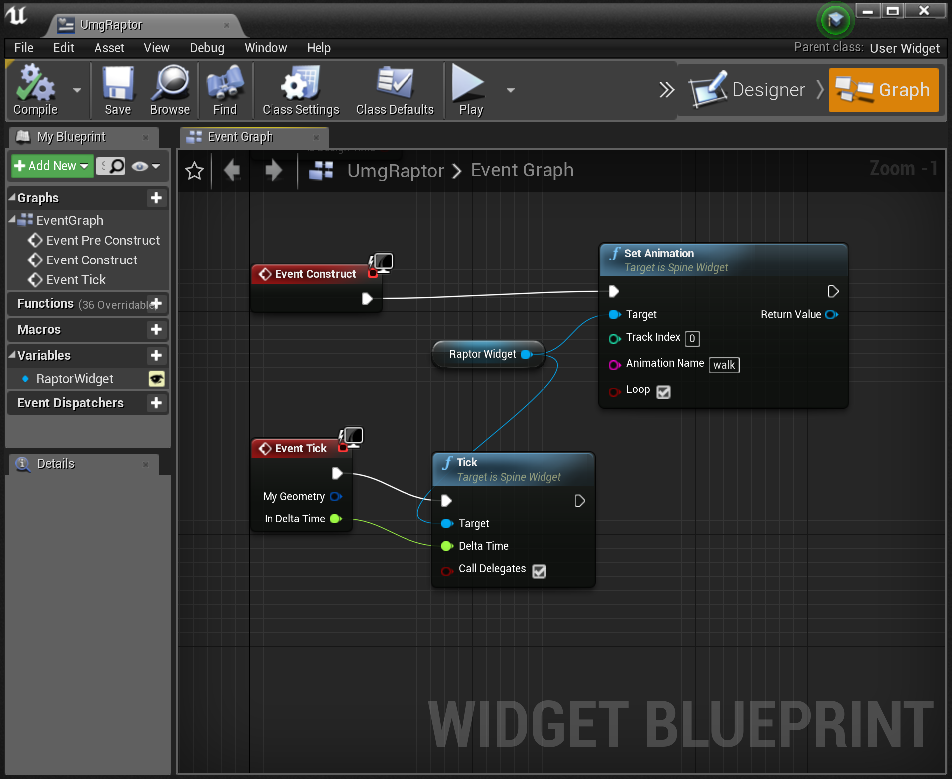 We set the initial animation of the raptor widget when the Construct event is fired. We also need to wire up the Tick event with the widget's Tick function so it animates.