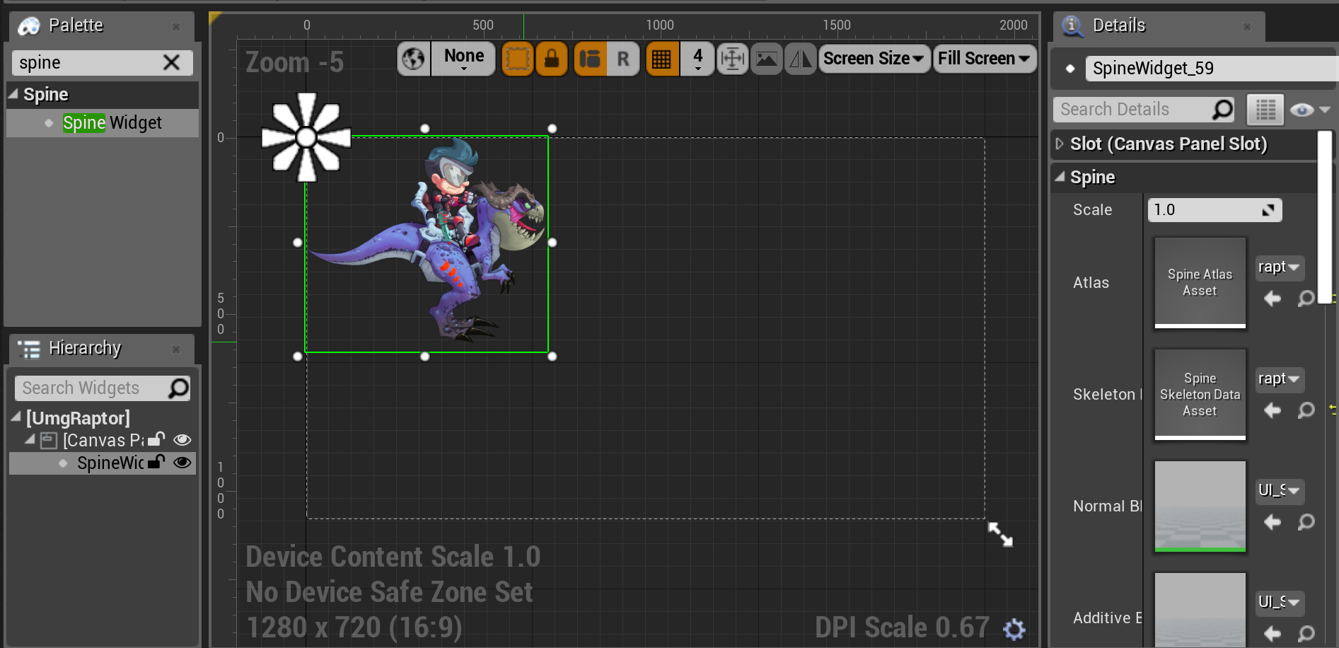 Next, set the atlas and skeleton data asset on the Spine widget, and resize it in the designer viewport to fit your requirements.