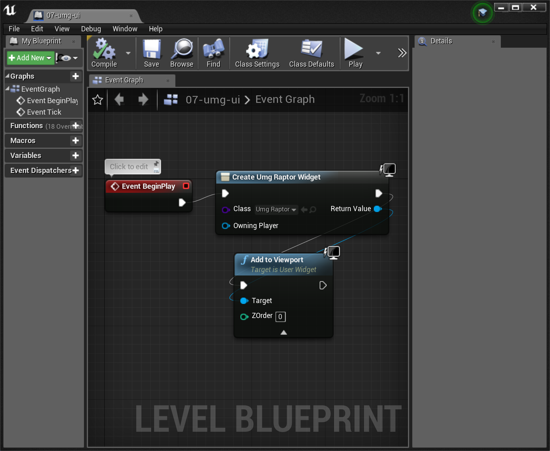 Finally, we need to open the level blueprint and add the UMG widget to the viewport: