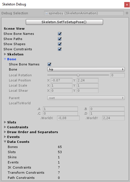 SkeletonUtilitycomponent to the GameObject for tracking or overriding bone positions. See SkeletonUtility for further info. - Debug. Sometimes you may want to know the current color of a slot or scale of a bone while the game is running. Pressing the Debug button opens the Skeleton Debug window which was created for this purpose. It allows you to inspect the current state of bones, slots, constraints, draw order, events and statistical information about your skeleton.