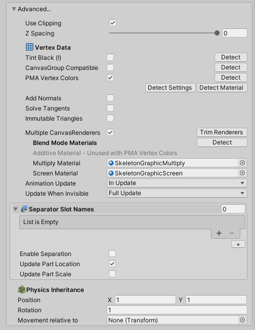 "Spine/SkeletonGraphic*"material, according toAdvanced - Vertex Datasettings. Same as Detect Material parameter in theAdvancedsection below. -