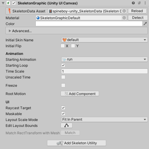 Detectbutton is provided which enables this parameter if the SkeletonGraphic component is located below aCanvasGroupcomponent in the hierarchy, and disables it otherwise. -
