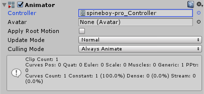 Note: most of the time you will want to use SkeletonAnimation, SkeletonMecanim or SkeletonGraphic (UI) instead. These components provide sophisticated means to control animation. Only when applying animations manually without transitions, as could be useful at a UI gauge element, this component may be useful as-is.
