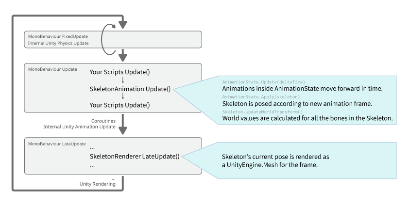 In the SkeletonAnimation component, AnimationState holds the state of all currently playing and queued animations. Every Update, the AnimationState is updated so that the animations progress forward in time. Then the new frame is applied to the Skeleton as a new pose.