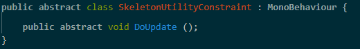 See example constraint classes SkeletonUtilityGroundConstraint and SkeletonUtilityEyeConstraint for how to write your own constraint classes.